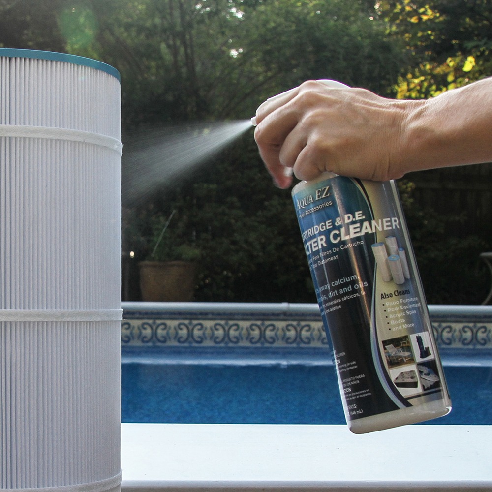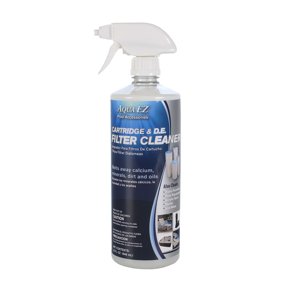 Spray and rinse filter cleaner for cartridge elements or DE filter grids. No soak formula saves time and money. Fresh orange scent. Extends life of the filter element.