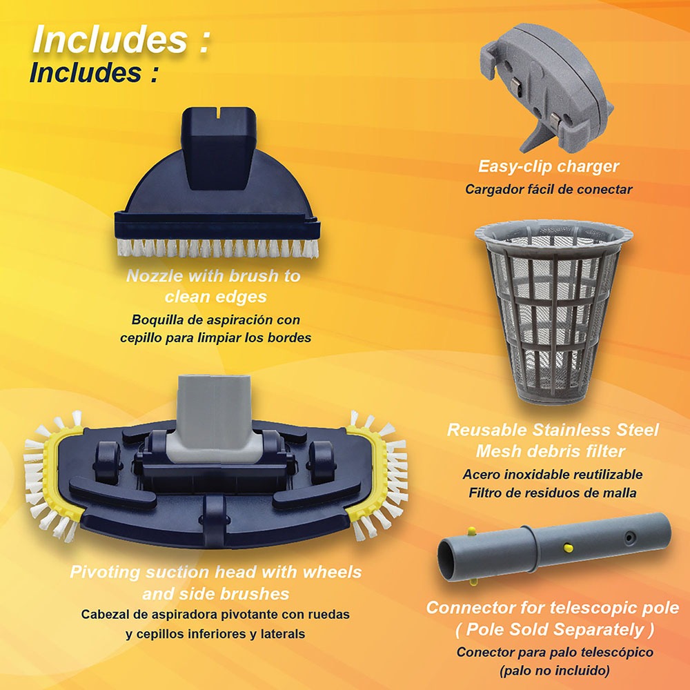 Rechargeable under water vacuum, ideal for cleaning up small debris in your pool or spa. Can be handheld or connected to any standard pool pole. Great for those quick clean ups.